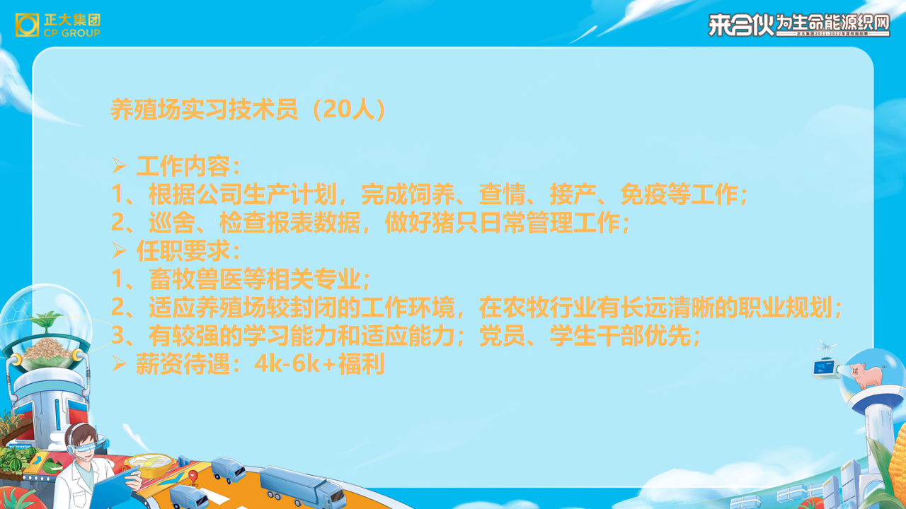 正大集团总部设在泰国曼谷,始创于1921年,目前是亚洲领先的综合性企业集团之一。正大集团于1979年进入中国,是第一家在中国投资的国际化企业。为实现集团“做世界的厨房,人类能源的供应者”的愿景,正大集团一直致力于满足中国13亿人口日益变化的需求提供“从农场到餐桌”的安全健康食品吉林中新正大食品有限公司隶属于泰国正大集团,公司坐落于吉林省吉林市国家级开发区,是由中国、新加坡与泰国正大三方合作的国家级重点项目,是一家集养殖、屠宰与食品深加工为一体的一条龙企业。项目具有100万头生猪养殖与屠宰加工能力,将筹备建设27座养殖场、一座饲料厂,一座食品加工厂,该项目是全产业链自繁自养模式的生猪深加工产业一体化项目,是吉林省重点建设项目。